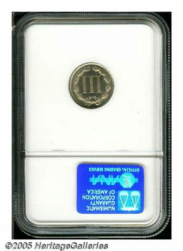 <B>1879<3CN> PR65 NGC.</B></I> Attractive lustrous example with some wispy gold color. A few spots are noted on the left pillar in the denomination. A small strike through is seen near OF. The devices have a somewhat frosty quality.