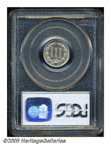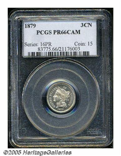 <B>1879<3CN> PR66 Cameo PCGS.</B></I> A brilliant and well struck Premium Gem that has good contrast between the devices and the mirrored fields. Faint "chatter," in the form several tiny planchet flaws (as struck) are seen on Liberty's cheek; otherwise, the obverse and reverse surfaces seem pristine. Population: 45 in 66 Cameo, 24 finer (6/05).