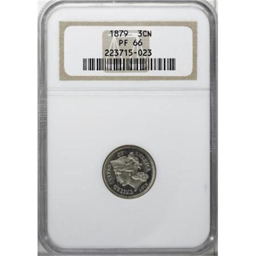 <B>1879 3CN PR66 NGC.</B></I> This Premium Gem proof displays pleasing field-motif contrast. Lightly toned surfaces are crisply impressed and nicely preserved.<BR><I>From The Southwest Collection.</B></I><BR><BR><B>Coin Engraver:</B> James B. Longacre<BR><BR><b>Shipping:</b> Coins & Currency (<a target="_blank" href="http://www.heritageauctions.com/common/shipping.php">view shipping information</a>)