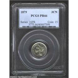 1879 3CN PR66 PCGS. Gold and lilac colors appear when the coin is rotated under a light. A needle-sharp Gem that has seemingly pristine and essentially carbonless surfaces. The bow is partially effaced, as struck due to a lapped die. Important notice: We expect to be auctioning lots at the rate of 200-250 per hour. Sometimes eBay Premier live bid software cannot keep up with that pace, so we strongly recommend that you place a realistic proxy bid now as insurance to avoid disappointment. Also please note that all Heritage/CAA lots purchased through eBay Premier carry a 20% Buyer's Premium. Please make sure you read the Terms and Conditions.
