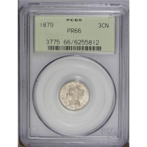 <B>1879<3CN> PR66 PCGS.</B></I> Unlike many examples of this issue, this Gem proof has mirrored fields, lustrous devices, and excellent cameo contrast. Both sides have brilliant nickel-gray surfaces with no evidence of toning. In a green-label holder and deserving of a review by PCGS to add the Cameo designation.<BR><I>From The David L. Goodwin Collection.</B></I> <BR><BR><B>Important notice:</B> Heritage usually auctions material at the rate of 200-250 lots per hour. On some occasions eBay Live bid software or the Internet may not be able to keep up with the pace of the auction. We recommend placing a realistic absentee bid now as insurance to avoid disappointment. Occasionally the auctioneer may eliminate or reject an eBay Live bid, and the auctioneer may also reopen a lot after the close of the eBay live bidding (usually because we missed an audience bid), and may reject your bid even if it shows you as the winning bidder. By bidding via eBay Live, you agree that Heritage may award the lot to another bidder at its sole discretion under the circumstances described above or any other reasonable circumstances. Since eBay bids are not shown to us until we open the lot on the floor, we treat those bids just like floor bids. In most cases the floor responds before the eBay bid is presented to us, due to Internet lag time, so for consistency we have made it a policy that floor bids are always considered first over tie eBay live bids. Also please note that all Heritage lots purchased through eBay Live carry a 20% Buyer's Premium. Please make sure you read the Terms and Conditions before you bid. This lot is being auctioned in conjunction with a live floor auction by Heritage Galleries & Auctioneers. All final auction and invoice information will be supplied by Heritage Galleries & Auctioneers, and all other information should be considered preliminary. Lot:818 <BR><BR><B>Winning Notification and Billing:</B> After the FINAL session in this auction is complete, Heritage will send e-mail and snail mail invoices. This process normally takes several days. All final auction and invoice information will be supplied by Heritage Galleries & Auctioneers, and all other information should be considered preliminary. <BR><BR>This auction will be conducted on a live auction floor and over the Internet through eBay Live. If you choose to place an absentee bid, please take a moment to <font color='#0000ff'><u><a href='http://pages.ebay.com/liveauctions/help/before/laabsentee.html'>learn how eBay Live absentee bidding works</a></u></font><font color='#000000'>