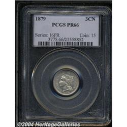 <B>1879<3CN> PR66 PCGS.</B></I> Well struck with lovely, smooth surfaces that seem unmarked. A small planchet flaw (as struck) resides on the upper obverse, just to the right of the F in OF.<BR><I>Ex: Greater San Francisco Area, John Cobb Sale (9/64), lot 667 where it sold for $35.</B></I> <BR><BR><B>Important notice:</B> Heritage usually auctions material at the rate of 200-250 lots per hour. On some occasions eBay Live bid software or the Internet may not be able to keep up with the pace of the auction. We recommend placing a realistic absentee bid now as insurance to avoid disappointment. Occasionally the auctioneer may eliminate or reject an eBay Live bid, and the auctioneer may also reopen a lot after the close of the eBay live bidding (usually because we missed an audience bid), and may reject your bid even if it shows you as the winning bidder. By bidding via eBay Live, you agree that Heritage may award the lot to another bidder at its sole discretion under the circumstances described above or any other reasonable circumstances. Since eBay bids are not shown to us until we open the lot on the floor, we treat those bids just like floor bids. In most cases the floor responds before the eBay bid is presented to us, due to Internet lag time, so for consistency we have made it a policy that floor bids are always considered first over tie eBay live bids. Also please note that all Heritage lots purchased through eBay Live carry a 20% Buyer's Premium. Please make sure you read the Terms and Conditions before you bid.