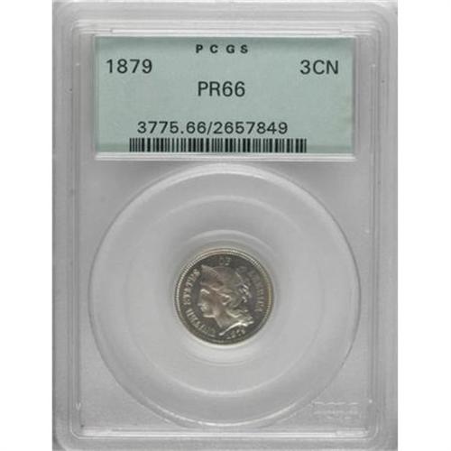 <B>1879 3CN PR66 PCGS.</B></I> The 8 and 9 in the date are filled. Well struck with highly reflective fields and pleasant light toning over both sides. The surfaces are immaculately preserved. The reverse die is rotated clockwise by approximately 25 degrees. An attractive Premium Gem representative of this low mintage proof issue. In a green label holder.<BR><I>From The Arnold & Harriet Collection, Part Two.</B></I><BR><BR><B>Coin Engraver:</B> James B. Longacre<BR><BR><b>Shipping:</b> Coins & Currency (<a target="_blank" href="http://www.heritageauctions.com/common/shipping.php">view shipping information</a>)