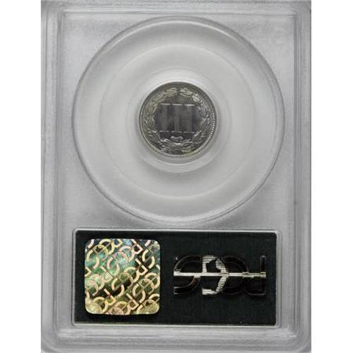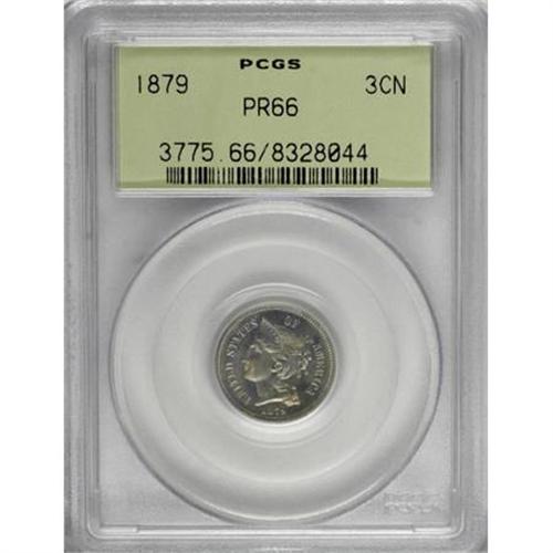 <B>1879 3CN PR66 PCGS.</B></I> Beautiful sun-gold, powder-blue, and rose toning illuminates this flashy and undisturbed Premium Gem. Encapsulated in an old green label holder.<BR><BR><B>Coin Engraver:</B> James B. Longacre<BR><BR><b>Shipping:</b> Coins & Currency (<a target="_blank" href="http://www.heritageauctions.com/common/shipping.php">view shipping information</a>)