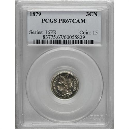 <B>1879 3CN PR67 Cameo PCGS.</B></I> A sharply struck Superb Gem, fully brilliant and has virtually pristine surfaces. A splendid proof type coin that shows excellent contrast. PCGS has graded no finer Cameo specimens (7/07).<BR><BR><b>Shipping:</b> Coins & Currency (<a target="_blank" href="http://www.heritageauctions.com/common/shipping.php">view shipping information</a>)
