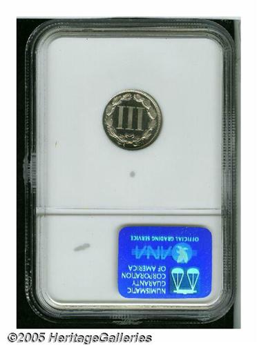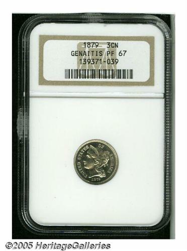 <B>1879<3CN> PR67 NGC.</B></I> Ex: Genaitis. Dazzling, nearly brilliant surfaces display just a hint of light toning in the right (facing) obverse field, and are free of mentionable marks. The design elements are exquisitely struck throughout. Population: 50 in 67, 4 finer (6/05).
