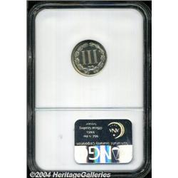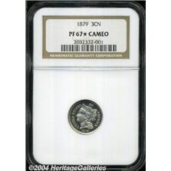 <B>1879<3CN> PR67 <S Cameo NGC.</B></I> Although the reverse has a hint of gold color, the contrast between the frosty devices and the deeply reflective fields is exceptional. This lovely and needle-sharp Superb Gem can be identified by a short lintmark immediately left of the first pillar in the denomination. Population: 2 in 67 <S, none finer (4/04). <BR><BR><B>Important notice:</B> Heritage usually auctions material at the rate of 200-250 lots per hour. On some occasions eBay Live bid software or the Internet may not be able to keep up with the pace of the auction. We recommend placing a realistic absentee bid now as insurance to avoid disappointment. Occasionally the auctioneer may eliminate or reject an eBay Live bid, and the auctioneer may also reopen a lot after the close of the eBay live bidding (usually because we missed an audience bid), and may reject your bid even if it shows you as the winning bidder. By bidding via eBay Live, you agree that Heritage may award the lot to another bidder at its sole discretion under the circumstances described above or any other reasonable circumstances. Since eBay bids are not shown to us until we open the lot on the floor, we treat those bids just like floor bids. In most cases the floor responds before the eBay bid is presented to us, due to Internet lag time, so for consistency we have made it a policy that floor bids are always considered first over tie eBay live bids. Also please note that all Heritage lots purchased through eBay Live carry a 20% Buyer's Premium. Please make sure you read the Terms and Conditions before you bid.