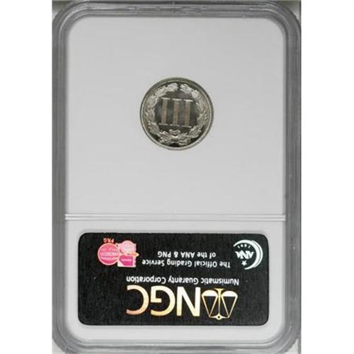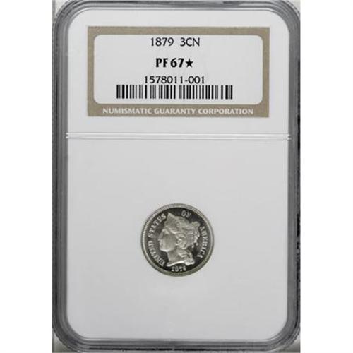 <B>1879 3CN PR67 <img src="/images/star.gif" width="10" height="10" alt="" border="0"> NGC.</B></I> This brilliant Superb Gem has a cameo obverse, which undoubtedly inspired the Star designation from NGC. The reverse wreath also exhibits contrast, although the Roman columns lack frost. Void of either carbon or contact.<BR><BR><B>Coin Engraver:</B> James B. Longacre<BR><BR><b>Shipping:</b> Coins & Currency (<a target="_blank" href="http://www.heritageauctions.com/common/shipping.php">view shipping information</a>)