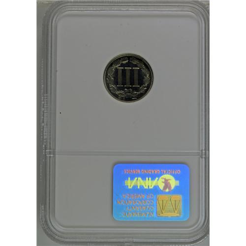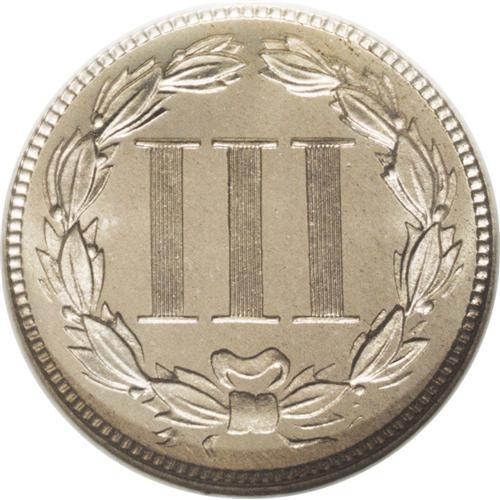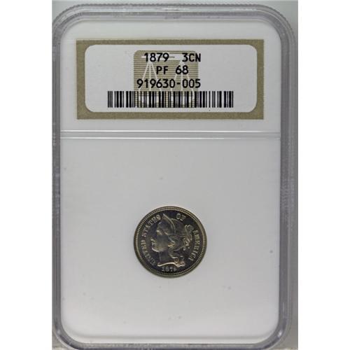 <B>1879<3CN> PR68 NGC.</B></I> The proofs of this issue were produced from three obverse dies. This die shows filling on neither the 8 nor the 9, and the date is further to the right than on other dies. The 9 is marginally higher and smaller than the remaining digits. The left serif of the 1 is over a space between two dentils. The reverse die, also used on the 1880 three cent nickels, shows fragmented ribbon and leaf details.<BR> Only one word is needed to describe the brilliance and light original champagne-gold color of this remarkable Superb Gem proof three cent nickel: Wow! The 1879 proof is just another date in the three cent nickel series, not overly scarce, even in grades as high as PR66. But the parade slows above that level, and stops at MS68. If only the finest will do, consider this piece. Census: 5 in 68, 0 finer (7/06).