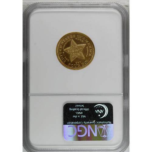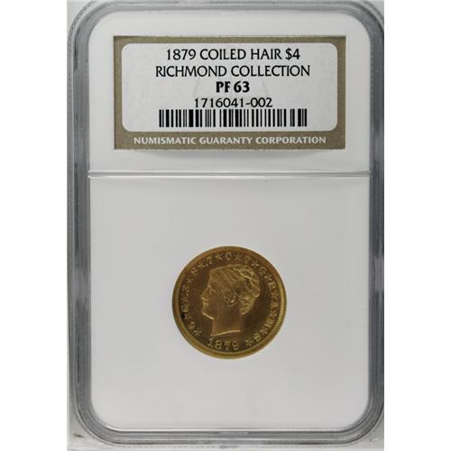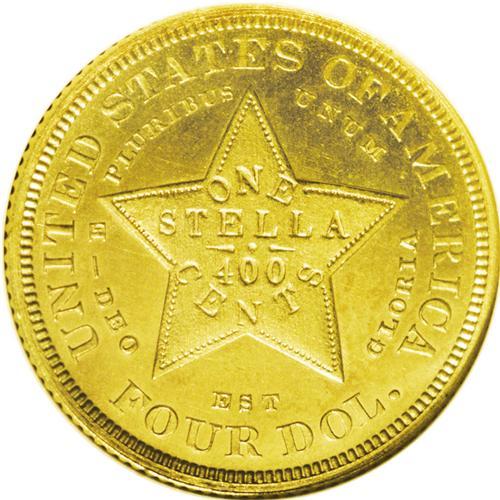 <B>1879<$4> Coiled Hair, Judd-1638, Pollock-1838, R.6, PR63 NGC.</B></I> Richmond Collection. The background of the stella is rooted in the attempt of 19th century America to solve the silver/gold relationship as well as create an international coinage. While some of Walter Breen's research has been repudiated in the years since his death, his grasp of the two issues that drove the mint to create the stella bears repeating: "This silver/gold 'rivalry' was to become subject matter for thousands of learned papers and books exhibiting mostly their authors' ignorance, reams of futile congressional debates, and eventually the main issue of the 1896 and 1900 presidential campaigns, inspiring William Jennings Bryan's obfuscatory 'Cross of Gold' speech. Underlying all the rhetoric were official policies only partly concealing the real issue, which was subsidies to wealthy mine owners while people starved in the streets."<BR> After Prussia went on the gold standard and dumped 8,000 tons of silver on the international metals market, the situation worsened for mine owners and silver proponents. New outlets were needed. The internationally accepted Trade dollar promoted Comstock silver abroad with an extra grain of silver in each coin to help guarantee acceptance of these coins (mostly in China). Also, the Bland-Allison Act was passed in 1878 and led to the creation of the Morgan dollar and the government requirement to purchase between two and four million ounces of silver per month of 'new' silver. Additionally, an international coinage was proposed in 1879 by Rep. John Kasson for a metric gold coinage that would contain both gold and 10% silver. These are the coins that we know today as stellas.<BR> As Mark Borckardt pointed out in the write-up for the PR67 1879 Flowing Hair stella, it is doubtful that such planchets were actually produced. It would have been more expedient for t