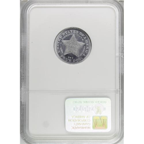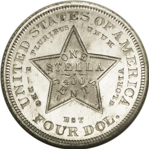 <B>1879 $4 Flowing Hair Four Dollar Stella, Judd-1637, Pollock-1835, High R.7, PR66 NGC.</B></I> Charles Barber's Flowing Hair design. Struck in aluminum with a reeded edge. This is a stunning light gray piece with fully mirrored fields and lustrous devices. Except for a few tiny specks on the devices, and faint hairlines that are barely visible in the reverse fields, this is a pristine representative. It is believed that just five or possibly six examples of this pattern are known in aluminum, including two pieces in this sale! Those known to exist include the Garrett-Bass coin, this example that appeared as part of a pattern stella set in Kagin's 50th Anniversary sale, the Jeff Browning Collection specimen, the Polis Collection (Bowers and Merena, 6/1991) example, and the gilt piece also offered in this sale. Five distinctly different specimens are listed here, although specific past pedigrees need further study, as two conflicting rosters were published in the early 1990s.<BR><I>Ex: Kagin's 50th Anniversary Sale (5/1978), lot 1061.</B></I><BR><I>From The Jones Beach Collection.</B></I><BR><BR><b>Shipping:</b> Coin/Currency (<a target="_blank" href="http://www.heritageauctions.com/common/shipping.php">view shipping information</a>)