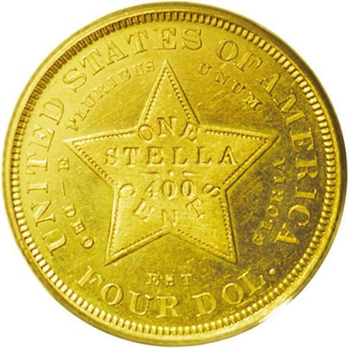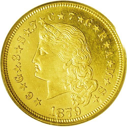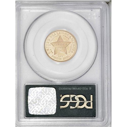 <B>1879<$4> Flowing Hair, Judd-1635, Pollock-1832, R.6, or 1833, R.3, PR64 PCGS.</B></I> The two Pollock numbers assigned to the 1879 Flowing Hair stella represent the belief that examples were coined in two different compositions, either standard or metric alloy. We have visited this issue in the past, and it is our position that all of the four-dollar gold pieces were coined in the standard coinage alloy of 90% gold and 10% copper. To produce these pieces, a strip of planchet stock for half eagles was rolled slightly thinner and planchets were punched with the standard flan cutter that was then in use for three-dollar gold pieces. Technicians at the Mint would have easily calculated the exact thickness of the planchet stock to create this denomination. Using the rolling mills and drawing bench, this exact thickness was obtained, but the process left parallel grooves or striae in the strip.<BR> The coinage dies had the head of Liberty and the star more deeply cut than all other details. When the coins were struck, these deepest crevices did not fully strike up, and the rolling marks remained visible. The present example has these striations clearly evident on both sides. To the best of our knowledge, there are no examples known that have no trace of these grooves. On some of the best struck examples, the striae are nearly invisible, but close examination will usually show some trace. The existence of these rolling marks clearly proves that these pieces are struck on 90% gold stock.<BR> In addition to the remarkably clear rolling marks, this piece has attractive light yellow-gold color with fully mirrored fields and lustrous devices. It is housed in an older green-label holder, used by PCGS prior to the addition of cameo and deep cameo designations. We believe that this piece should warrant a cameo designation. A few faint hairlines and other insignificant abrasions keep it out of the Gem class, but it is a highly appealing and desirable example.