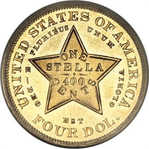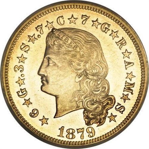 <B>1879 $4 Flowing Hair, Judd-1635, Pollock-1833, R.3, PR62 PCGS.</B></I> Charles Barber and George Morgan played out their own version of "Dueling Banjos" at the Philadelphia Mint in the late 1870s. The Mint's chief engraver and assistant engraver each produced their own designs for all of the silver denominations in 1879. Today, Barber's work is known as the Washlady Design, while Morgan created his Schoolgirl design. Ultimately, neither design was delivered into production. Both artists also participated in the experimental metric coinage program, including designs for the proposed four dollar gold piece.<BR> These patterns were the result of a February 19, 1879 letter written by Alexander H. Stephens to John Sherman. Stephens was chairman of the Committee of Coinage, Weights, and Measures, and Sherman was the Secretary of the Treasury. The letter that Stephens wrote spelled out every aspect of the design, though he was a little vague about the central obverse device.<BR> Stephens wrote: "Will you please have a specimen or specimens, say five, of this coin struck? The obverse design similar to that of a double eagle = 6G. .3S. .7C., 7 grams--1879. The reverse--"United States of America. Four Dollars. E pluribus unum. Deo est gloria," and a large star emblazoned, in the words, 'One stella, 400 cents' ..."<BR> In <I>United States Patterns and Related Issues</B></I>, Andrew W. Pollock, III describes the Charles Barber Flowing Hair design:<BR><BR>"Obverse: Head of Liberty with flowing hair facing left, with the inscription <B><img src="/images/star.gif" width="10" height="10" alt="" border="0"></B></I> 6 <B><img src="/images/star.gif" width="10" height="10" alt="" border="0"></B></I> G <B><img src="/images/star.gif" width="10" height="10" alt="" border="0"></B></I> .3 <B><img src="/images/star.gif" width="10" height="10" alt="" border="0"></B></I> S <B><img src="/images/star.gif" width="10" height="10" alt="" border="0"></B></I> .7 <B><img src="/images/star.gif" width="10" height="10" alt="" border="0"></B></I> C <B><img src="/images/star.gif" width="10" height="10" alt="" border="0"></B></I> 7 <B><img src="/images/star.gif" width="10" height="10" alt="" border="0"></B></I> G <B><img src="/images/star.gif" width="10" height="10" alt="" border="0"></B></I> R <B><img src="/images/star.gif" width="10" height="10" alt="" border="0"></B></I> A <B><img src="/images/star.gif" width="10" height="10" alt="" border="0"></B></I> M <B><img src="/images/star.gif" width="10" height="10" alt="" border="0"></B></I> S <B><img src="/images/star.gif" width="10" height="10" alt="" border="0"></B></I> around and the date below. A coronet in Liberty's hair is inscribed LIBERTY. The Liberty Head motif is very similar to that featured on 1878-dated Flowing Hair $5 patterns, varieties [1766] and [1767]. The point of Liberty's coronet touches or nearly touches the star between .7 and C. Reverse: a five-pointed star inscribed in incuse lettering ONE STELLA 400 CENTS. Around the star are the mottoes DEO EST GLORIA and E PLURIBUS UNUM. At the border above is the legend UNITED STATES OF AMERICA, and below is the denomination FOUR DOL."<BR><BR> The George Morgan Coiled Hair design is identical, except for the obverse device: "Miss Liberty's hair is braided and coiled at the back of her head. She is wearing a ribbon inscribed LIBERTY."<BR> Although we have no knowledge of his response, Stephens may have been displeased with what he saw, as neither design is similar to the current double eagle design. Examples were produced in a variety of compositions, including copper, aluminum, white metal, and standard gold alloy.<BR> This splendid proof has gorgeous yellow-gold color with reflective surfaces and lustrous devices. A few faint hairlines on each side prevent a higher numerical grade, but the overall eye appeal certainly suggests a finer coin. The central obverse and reverse designs are somewhat weak as usual. Fine roller or drawing marks are present on both sides, slanting up to the right on the obverse and down to the left on the reverse.<BR><I>Ex: Cleveland Coin Auctions, 3/64, lot 484.<BR>From The John Stimson, Sr. Collection, Part One.</B></I><BR><BR><B>Coin Engraver:</B> Charles E. Barber<BR><BR><b>Shipping:</b> Coins & Currency (<a target="_blank" href="http://www.heritageauctions.com/common/shipping.php">view shipping information</a>)