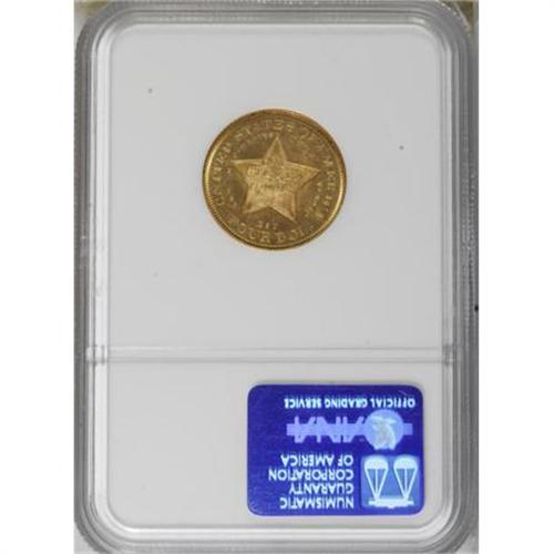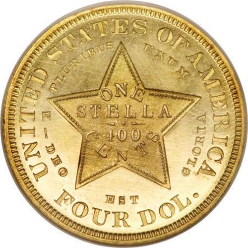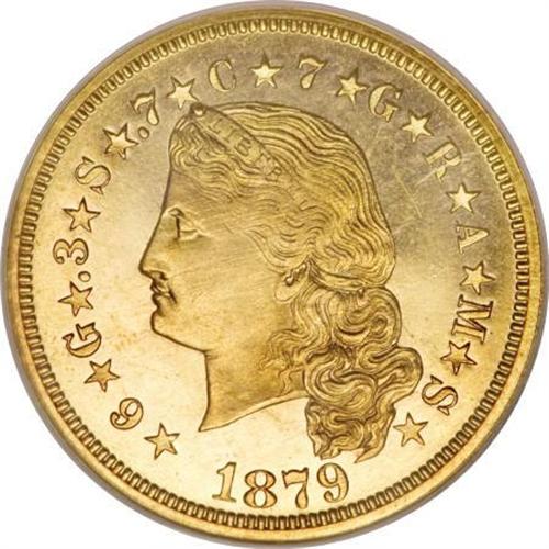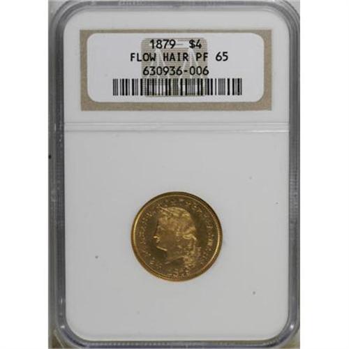 <B>1879 $4 Flowing Hair, Judd-1635, Pollock-1833, R.3, PR65 NGC.</B></I> Of the thousands of patterns produced by the United States Mint, all but a handful are collected and studied almost exclusively by specialists. The highly elusive nature of such pieces, not to mention the cost and the impossibility of forming a complete set, limits their popularity to a small subset of numismatists. As far back as 1883, a time when pattern production was ongoing (if not so active as in earlier decades), certain collectors described patterns largely as curiosities, not worthy of serious analysis. In his introduction to <I>United States Gold Patterns</B></I>, David Akers (1975) quoted Patterson Du Bois, author of a January 1883 article, "The Pattern Piece," published in the <I>American Journal of Numismatics</B></I>. His description of such items is vivid and memorable: <BR><BR>"Open for me your cabinet of Patterns, and I open for you a record, which but for these half-forgotten witnesses, would have disappeared under the finger of Time. Read to me their catalogue, and I read to you, in part, at least, the story of an escape from the impractical schemes of visionaries and hobbyists--a tale of national deliverance from minted evil."<BR><BR>Today, far from perceiving patterns as "deliverance from minted evil," collectors consider them to be fascinating detours from regular-issue coinage, often with their own artistic and technical merits. In addition, while most such pieces are far from readily available, a handful of patterns were produced in sufficient quantity that they are considered collectible, not only by pattern specialists, but by the general population of U.S. coinage enthusiasts. The Flying Eagle cents of 1856 are a famous example, and, among gold coins, the 1907 Saint-Gaudens eagles with wire rim and periods at E PLURIBUS UNUM are sometimes collected alongside the regular issues. One widely collected pattern, however, is not collected alongside any series, since it occupies a singular place in the annals of American coinage. That piece is the 1879 Flowing Hair stella.<BR> Originally, the 1879 Flowing Hair stella was like many other pattern issues, produced in highly limited qualities. Pollock (1994) quotes research by R.W. Julian, published in the November 1987 edition of <I>The Numismatist</B></I> under the title "The Stella: Its History and Mystery," that claims that just 25 sets of three coins, each containing an 1879 Flowing Hair stella, as well as an 1879 metric dollar (Pollock-1813) and an 1879 goloid dollar (Pollock-1822), were produced and distributed to Congress. A previous estimate of only 15 sets appeared in Akers. The story might have ended there, with the pieces winding up as rarities in scattered pattern cabinets and generally unappreciated by numismatists at large.<BR> Congress, or more accurately, members of Congress who saw the pieces and wanted examples of their own, intervened. Early in 1880, the Mint struck off further three-coin sets, which were then made available to legislators at cost. A famous contemporary diatribe by S.K. Harzfeld, described in Breen's <I>Encyclopedia</B></I> and elsewhere, noted with some bitterness that the gift-giving of representatives and senators had led to the patterns appearing in the hands of "boarding house keepers" and women of ill repute. The pieces also attracted the attention of contemporary collectors, who soon discovered that while Congressmen could obtain the coins, they could not, except by working through various agents who claimed Mint connections. In many ways, this 19th century pursuit of the sets containing the stella cemented its reputation as desirable, though the odd denomination made the four dollar gold pieces more sought-after than the accompanying goloid and metric dollars; the lower-denomination pieces never achieved the same cachet.<BR> Since a number of 1879 Flowing Hair stellas are known in various states of impairment, the search for an attractive and well-preserved example can prove long and occasionally frustrating. This delightful Gem exemplar should prove a welcome change to the discerning collector. Honey-gold, orange, and apricot-wheat shades converge on the shining surfaces. Faint striations cross the portrait and the central highpoints show a hint of softness, both suggestive of this piece being one of the 1880 restrikes. A few tiny points of contact are present at the margins, but these flaws are trivial in light of the pattern's incredible visual appeal. In short, this is an astonishingly beautiful survivor that merits a place in a world-class collection.<BR><BR><B>Coin Engraver:</B> Charles E. Barber<BR><BR><b>Shipping:</b> Coins & Currency (<a target="_blank" href="http://www.heritageauctions.com/common/shipping.php">view shipping information</a>)