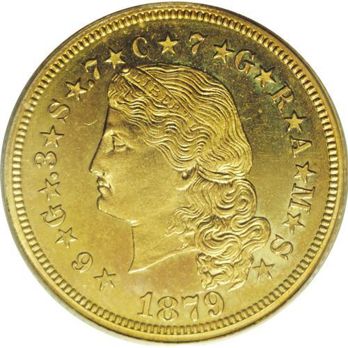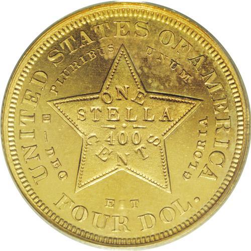 <B>1879 $4 Flowing Hair, Judd-1635, Pollock-1833, R.3 PR64 Cameo NGC.</B></I> The planchet striations on this piece are nearly vertical, and faintly visible on the highest design points. They also extend into the fields above and below, although this is barely detectable without a magnifier. We always try to mention the planchet striations as they represent an important aspect of production for these pieces. They are also highly useful for pedigree research. A substantial number of stellas still exist today, in a wide range of grades. As the direction or orientation of the planchet striations is a random matter, pedigree researchers realize that two offerings cannot be the same specimen if the striations are running in different directions.<BR> Technically, the gold stellas are pattern issues with limited mintages, although it is now believed that there may have been as many as 800 or even 1,000 of these "patterns," including a number of restrikes made a few years later. For many years, the mintage figure was quoted at just 400 pieces, however, it is known that restrikes were produced, thus the higher figures. It may be the case that nearly 400 of these still survive today in various grades, many impaired.<BR> This lovely proof has rich greenish yellow-gold color with deeply mirrored fields and fully lustrous devices. A thin hairline crosses Liberty's cheek vertically, nearly parallel to the planchet striations, and this undoubtedly accounts for the limited grade of this piece. A hint of rose iridescence is visible above the date with a small patch of hazy blue color behind the hair curls. The upper reverse also has some hazy patina. This is a pleasing example that any collector should be happy to own.<BR><BR><b>Shipping:</b> Coin/Currency (<a target="_blank" href="http://www.heritageauctions.com/common/shipping.php">view shipping information</a>)