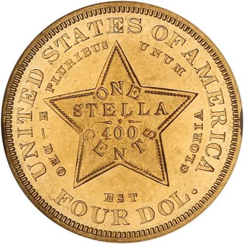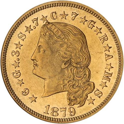 The 1879 Flowing Hair Stella is by all accounts a Pattern, it has been widely desired by collectors since the time of inception. For this reason, it has been included in regular catalogs, among which have been Wayte Raymond's "Standard Catalogue of United States Coins," published in 18 editions from 1935 to 1958, plus the ubiquitous "Guidebook of United States Coins" we all use today. To read about a Stella and see an image of one is to develop a possession desire. But to hold one in your hands imparts a warm glow to one's consciousness. Historically, year in and year out these have been in great demand and are destined to be into the far-flung future. It is always a pleasure to offer one in our sales <b>(PCGS # 8057)</b> <i>