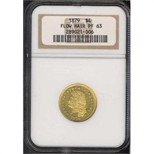 <b>1879 $4 Gold. Flowing hair. NGC graded Proof 63.</b> Housed in an NGC grading holder, this historic choice quality Four-Dollar gold piece, or "Stella" as it came to be known, was proposed to solve a couple of problems facing the United States system of coinage in the 1870s. The first was to make a coin whose "intrinsic measure and value" as part of the design was sufficient to make it useful as an international trade coin. The other, as a bone tossed to the silver "interests" as they were called, was to strike these in an alloy that used either 4% silver or 10% silver, thereby increasing sales of this semi-precious metal by the silver mining states. For all its intended merits, the Stella project was soon abandoned. But only after 425 1879 Flowing Hair coins were minted, split into two groups, 25 of which are considered "originals" and made in 1879, followed by 400 strikes from the same dies made in 1880 after Congressmen got involved in the proposal and wanted representative samples, for purely altruistic purposes. This is among the most eye-catching Proof 63 examples bidders will see or third-party graders will certify. It has nice reflective "mirrors" that have a hint of satiny luster typical of the issue. The presence of faint striations running diagonally through Liberty's upper hair is also entirely consistent with the series of $4 coins. On the present specimen, the central obverse hair curls, which are nicely detailed, are almost as bold in execution as you are bound to see. The sharpness transfers over to the star's center and dotted border, which usually doesn't show this amount of detail. An endlessly-popular denomination, the 1879 Flowing Hair $4 Stella has long been prized as an integral part of a complete United States gold coin collection or Type set. This handsome Proof among the better ones we've seen.