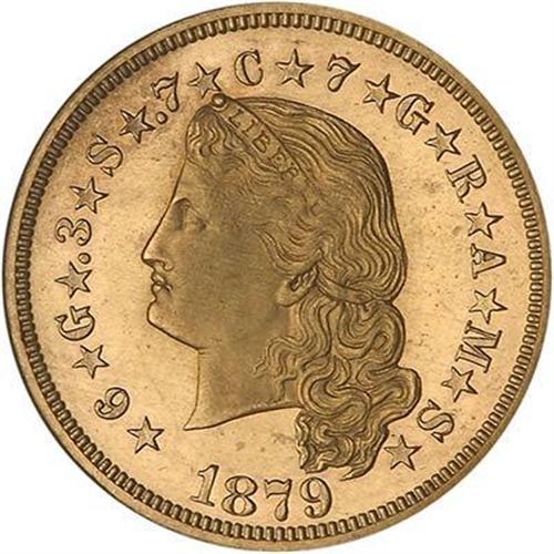Housed in early NGC grading holder #239507-002, this historic cameo-quality Four-Dollar gold piece, or "Stella" as it came to be known, was proposed to solve a couple of problems facing the United States system of coinage in the 1870s. The first was to make a coin whose "intrinsic measure and value" as part of the design was sufficient to make it useful as in international trade to compete with similarly sized Continental gold coins as well as the English sovereign. The other, as a bone tossed to the Western silver mining "Interests" as they were called, was to strike these using an alloy with either 4% silver or 10% silver, thereby increasing sales of this semi-precious metal by the silver mining states. Despite all the hoopla surrounding the issue, the Stella project was quickly abandoned and forgotten by all but consummate coin collectors. With 425 1879 Flowing Hair coins minted, split into two groups, 25 of which are considered "originals" and made in 1879, followed by 400 strikes from the same dies made in 1880, this is a scarce offering in choice condition. Among the survivors, this is an eye-catching frosted Proof 64, one of the freshest examples in its class you will ever see certified by a third-party grader. Lightly toned and gleaming with golden originality!