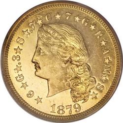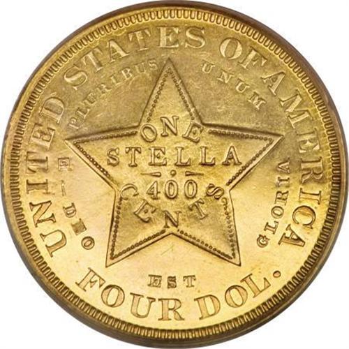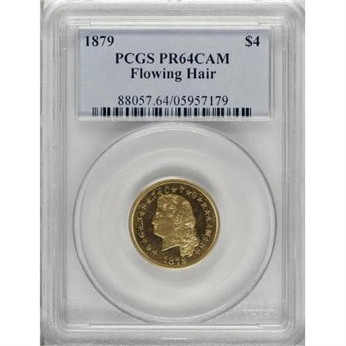 <B>1879 $4 PR64 Cameo PCGS.</B></I> Judd-1635, R.3. Today, travel-related commerce between European countries is aptly facilitated by the euro, which was introduced in 1999 to alleviate the problems that had faced international voyagers for centuries before. The Honorable John Adam Kasson (1822-1910) was a U.S. politician and lawyer from Iowa during the second half of the 19th century. His political appointments required travel throughout Europe and, through his tours, he had first-hand experience with the inconvenience of conducting business across international currencies. Even the simplest of transactions at a merchant often resulted in the awkward--and probably inaccurate--conversion of American hard currency into the local monetary unit. Change was required since the various European currencies, and of course the U.S. dollar, did not have denominations that were truly equal to one another. <BR> Thus was born the idea for the American stella, or four dollar gold piece, which Kasson suggested to Secretary of State John Sherman in early 1879. Kasson had all of the credentials for developing a solution to the international currency debacle: He was chairman of the U.S. House Committee on Coinage, Weights, and Measures from 1863 to 1867; helped negotiate postal conventions between Germany, France, Great Britain, Italy, Switzerland, Belgium, and Holland in 1867; and was the U.S. ambassador to Austria-Hungary from 1877 to 1881. Kasson devised a plan to alleviate the problems facing those, especially Americans, who traveled throughout Europe. He calculated that a gold coin of four U.S. dollars would approximate the Austrian eight florin, French twenty franc, Italian twenty lire, Spanish twenty pesetas, and Dutch eight florin coins, within a few cents (Breen, 1977). <BR> It seemed foolish to produce a coin that only approximated other currencies, since change would still be needed. However, a perfect solution was not feasible, since the values of the various currencies floated against each other at varying rates. Determining the actual intrinsic value of each piece was really the only way to solve the problem, even though change would still be required. The idea of a single currency that would solve the problem was idealistic at best, but dignified in its simplicity. <BR> Perhaps through political allies, the Committee on Coinage, Weights, and Measures in 1879 favored Kasson's idea. Production of a limited number of sample four dollar gold coins was ordered by the Mint, to provide government officials with a prototype of the proposed international currency. As such, stellas--so named for the large star on the reverse (from the Latin "stella," meaning star)--are technically patterns, the current piece attributed as Judd-1635. It is believed that only 15 pieces of the Flowing Hair stellas were coined in 1879, although it is now believed that between 600 and 700 additional patterns were struck in 1880 from the original dies. Since it is difficult to differentiate between the originals and so-called restrikes, all 1879 Flowing Hair stellas, as engraved by Charles Barber, are considered Judd-1635. Patterns were also produced in copper, aluminum, and white metal. George Morgan designed a similar issue for 1879, which shares the same reverse die, but the obverse is of a Coiled Hair design (Judd-1638). <BR> The 1879 Flowing Hair four dollar pieces are the most available today, even though they are hardly considered common. Many are impounded in collections and numerous examples are circulated or impaired, suggesting that members of Congress, the intended recipients, treated the stellas as souvenirs. Competition for attractive, high grade specimens is fierce, as evinced by the strong prices realized whenever a stella crosses the auction block.<BR> The current piece is one of 17 designated at PR64 Cameo at PCGS, with 18 grading finer within the Cameo designation (3/08). As one would expect from a Cameo coin, the devices are noticeably frosted with deeply contrasting mirrorlike fields. The surfaces have a slight reddish tinge and are fully struck. As seen on most stellas, there are numerous roller marks in the center of the obverse; on this piece, they are almost vertical. An essentially defect-free stella and a commanding example of this important and popular experimental coinage.<BR><BR><b>Shipping:</b> Coins & Currency (<a target="_blank" href="http://www.heritageauctions.com/common/shipping.php">view shipping information</a>)