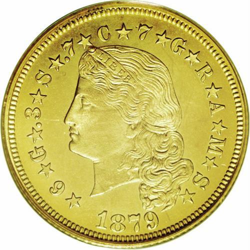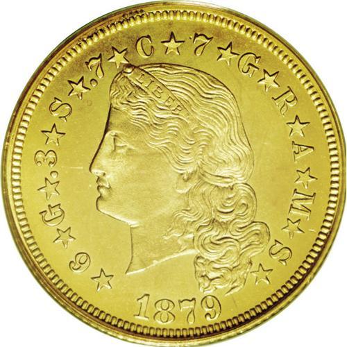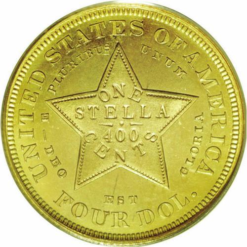 <B>1879<$4> PR65 Deep Cameo PCGS.</B></I> This impressive Gem stella has deeply mirrored fields masked by a slightly hazy appearance. The devices have frosty mint luster, imparting the wonderful contrasting appearance that is so desirable today; although at one time it was considered a negative characteristic. Fine parallel striations cross both surfaces diagonally, and in the same relative direction on each side of this beautiful Gem. Such planchet striations are seen to some extent on every known example of this issue. Usually only visible on the devices, this example retains evidence of the striations in the fields, as well. The obverse has a tiny lintmark between the border and star 12. Small, dark planchet defects are visible beneath the E of STATES. The central obverse design details are a trifle weak, but all other aspects are fully defined.<BR> The four dollar gold piece, or stella as it is called, is one of our favorite issues, combining rarity, beauty, and history. Charles Barber prepared the design for this issue. He had just assumed the position of chief engraver at the Mint from his father, William, who passed away earlier the same year. George Morgan, assistant engraver to both Barber's, prepared the other stella design, the Coiled Hair version. Technically a pattern coin, only the 1879 Flowing Hair issue is reasonably easy to acquire. Three other varieties, the 1879 Coiled Hair, 1880 Flowing Hair, and 1880 Coiled Hair coins are each extremely rare.<BR> The purpose behind the stella was international trade. It was felt desirable to have a United States gold coin of such a value that it would be equivalent to numerous European gold coins. The Honorable John Kasson was the United States Minister to Austria in the late 1870s, thus he was specifically interested in a U.S. coin valued similarly to the Austrian eight florin piece. This Austrian gold coin, with a