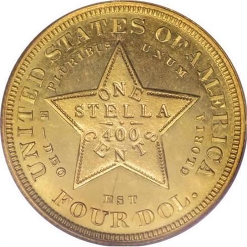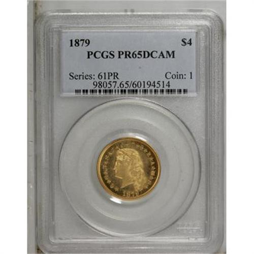 <B>1879 $4 Flowing Hair, Judd-1635, Pollock-1833, R.3, PR65 Deep Cameo PCGS.</B></I> This impressive Gem stella has deeply mirrored fields masked by a slightly hazy appearance. The devices have frosty mint luster, imparting the wonderful contrasting appearance that is so desirable today; although at one time it was considered a negative characteristic. Fine parallel striations cross both surfaces diagonally, and in the same relative direction on each side of this beautiful Gem. Such planchet striations are seen to some extent on every known example of this issue. Usually only visible on the devices, this example retains evidence of the striations in the fields, as well. The obverse has a tiny lintmark between the border and star 12. Small, dark planchet defects are visible beneath the E of STATES. The central obverse design details are a trifle weak, but all other aspects are fully defined.<BR> The four dollar gold piece, or stella as it is called, is one of our favorite issues, combining rarity, beauty, and history. Charles Barber prepared the design for this issue. He had just assumed the position of chief engraver at the Mint from his father, William, who passed away earlier the same year. George Morgan, assistant engraver to both Barber's, prepared the other stella design, the Coiled Hair version. Technically a pattern coin, only the 1879 Flowing Hair issue is reasonably easy to acquire. Three other varieties, the 1879 Coiled Hair, 1880 Flowing Hair, and 1880 Coiled Hair coins are each extremely rare.<BR> The purpose behind the stella was international trade. It was felt desirable to have a United States gold coin of such a value that it would be equivalent to numerous European gold coins. The Honorable John Kasson was the United States Minister to Austria in the late 1870s, thus he was specifically interested in a U.S. coin valued similarly to the Austrian eight florin piece. This Austrian gold coin, with a value equal to 20 French francs, contained 0.1867 ounces of actual gold, for an equivalent face value of $3.86. Kasson made his proposal to John Sherman, the Treasury secretary and Alexander Stephens, chairman of the Coinage Committee. Additional details were provided by Pennsylvanian, Dr. Wheeler W. Hubbell, who preferred the metric coinage system and who held patents for his goloid coinage composition.<BR> Although the inscription of the coin provided for a composition of gold, silver, and copper, with 85.71% of the coin consisting of actual gold, it is believed that all examples were actually produced on standard 90% gold planchets. These pieces are the same diameter as half eagles, with half eagle planchet stock rolled thinner (accounting for the striations from the drawing bench), and punched with the standard half eagle planchet punch. Had the experiment been approved and the coinage authorized, Mint personnel would not have continued such a luxury. They would then have found it necessary to create a new metric alloy and develop new equipment to produce the appropriate planchets. Fortunately for them, and for us today, such a laborious process was not necessary.<BR><BR><b>Shipping:</b> Coins & Currency (<a target="_blank" href="http://www.heritageauctions.com/common/shipping.php">view shipping information</a>\)