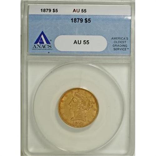 <B>1879 $5 AU55 ANACS.</B></I> NGC Census: (28/423). PCGS Population (37/215). Mintage: 301,950. Numismedia Wsl. Price for NGC/PCGS coin in AU55: $210. (#8348)<BR><BR><B>Coin Engraver:</B> Christian Gobrecht<BR><BR><b>Shipping:</b> Coins & Currency (<a target="_blank" href="http://www.heritageauctions.com/common/shipping.php">view shipping information</a>)