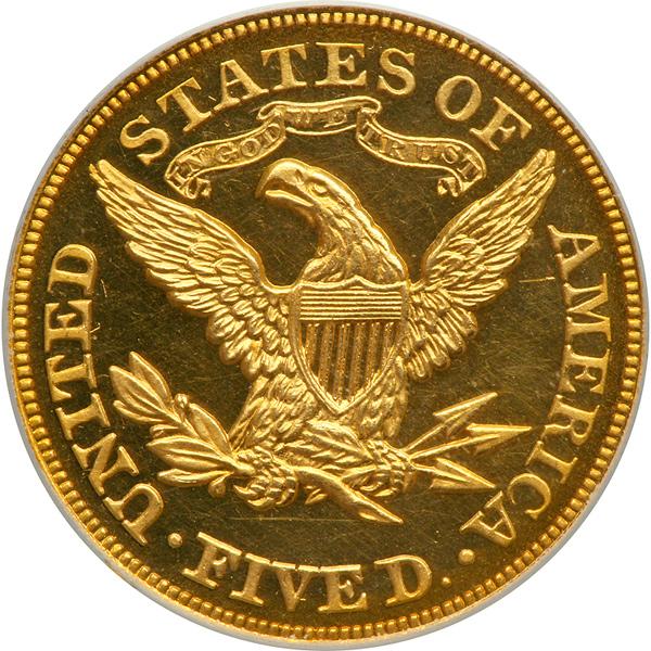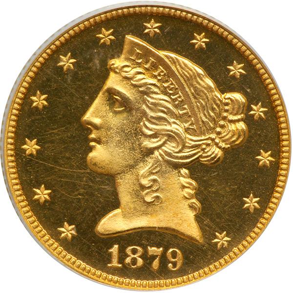 1879 $5 Liberty. PCGS graded Proof 64 Deep Cameo Plus. CAC Approved. In a new PCGS Secure Shield holder. A lovely gem coin that should be PR65DCAM. Only 30 proofs minted. Pop 1; the finest gold DCAM graded at PCGS. Struck with preciseness only now and then found on Proofs of this vintage, the hair curls and hair bun are needle-sharp while the eagle displays its feathers as though it were before a live audience of dignitaries. This boldly detailed representative is mostly vivid gold in color with sleek, bright metallic frosted features including all stars and letters in the legends. The contrast is cameo-deep and resplendent.