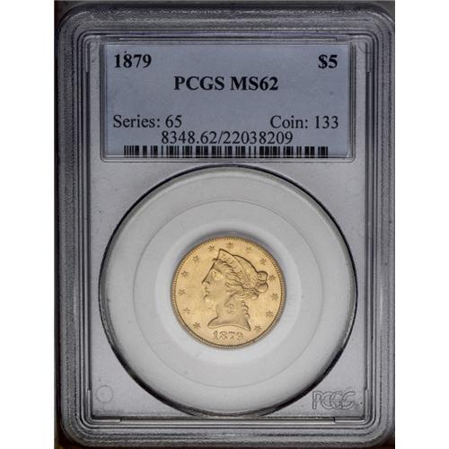 <B>1879<$5> MS62 PCGS.</B></I> Extremely pretty honey-gold surfaces with loads of luster but a few microscopic dark flecks. Robustly struck, with a few light grade-consistent abrasions visible under a loupe. Population: 39 in 62, 28 finer (3/06). <BR><BR><B>Important notice:</B> Heritage usually auctions material at the rate of 200-250 lots per hour. On some occasions eBay Live bid software or the Internet may not be able to keep up with the pace of the auction. We recommend placing a realistic absentee bid now as insurance to avoid disappointment. Occasionally the auctioneer may eliminate or reject an eBay Live bid, and the auctioneer may also reopen a lot after the close of the eBay live bidding (usually because we missed an audience bid), and may reject your bid even if it shows you as the winning bidder. By bidding via eBay Live, you agree that Heritage may award the lot to another bidder at its sole discretion under the circumstances described above or any other reasonable circumstances. Since eBay bids are not shown to us until we open the lot on the floor, we treat those bids just like floor bids. In most cases the floor responds before the eBay bid is presented to us, due to Internet lag time, so for consistency we have made it a policy that floor bids are always considered first over tie eBay live bids. Also please note that all Heritage lots purchased through eBay Live carry a 20% Buyer's Premium. Please make sure you read the Terms and Conditions before you bid. This lot is being auctioned in conjunction with a live floor auction by Heritage Galleries & Auctioneers. All final auction and invoice information will be supplied by Heritage Galleries & Auctioneers, and all other information should be considered preliminary. Lot:2798 <BR><BR><B>Winning Notification and Billing:</B> After the FINAL session in this auction is complete, Heritage will send e-mail and snail mail invoices. This process normally takes several days. All final auction and invoice information will be supplied by Heritage Galleries & Auctioneers, and all other information should be considered preliminary. <BR><BR>This auction will be conducted on a live auction floor and over the Internet through eBay Live. If you choose to place an absentee bid, please take a moment to <font color='#0000ff'><u><a href='http://pages.ebay.com/liveauctions/help/before/laabsentee.html'>learn how eBay Live absentee bidding works</a></u></font><font color='#000000'>