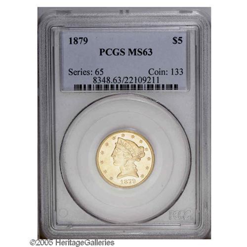 <B>1879<$5> MS63 PCGS.</B></I> Bright yellow gold composes the surfaces and the fields are semi-prooflike in nature. Adding to the appeal, relatively few abrasions are seen. A premium example for the grade that is worthy of a premium bid.
