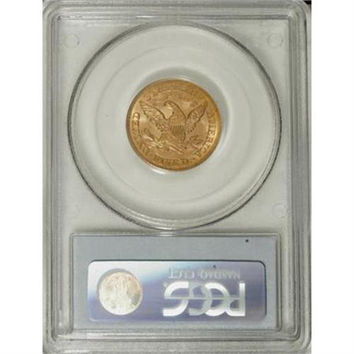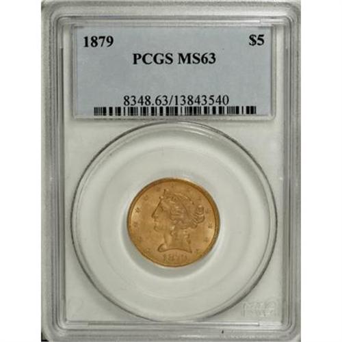 <B>1879 $5 MS63 PCGS.</B></I> Boldly impressed with satiny luster, this luminous Select example offers a lovely orange-gold appearance with a touch of pink-rose in the fields. An attractive survivor from an original mintage of just over 300,000 pieces. Population: 23 in 63, 8 finer (7/07).<BR><BR><B>Coin Engraver:</B> Christian Gobrecht<BR><BR><b>Shipping:</b> Coins & Currency (<a target="_blank" href="http://www.heritageauctions.com/common/shipping.php">view shipping information</a>\)