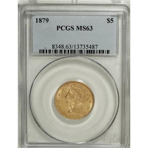 <B>1879 $5 MS63 PCGS.</B></I> A frosty yellow-gold Select example of this Hayes-era issue, exquisitely detailed in the centers with faint, scattered abrasions. Eminently appealing. Population: 24 in 63, 9 finer (8/07).<BR><BR><B>Coin Engraver:</B> Christian Gobrecht<BR><BR><b>Shipping:</b> Coins & Currency (<a target="_blank" href="http://www.heritageauctions.com/common/shipping.php">view shipping information</a>)