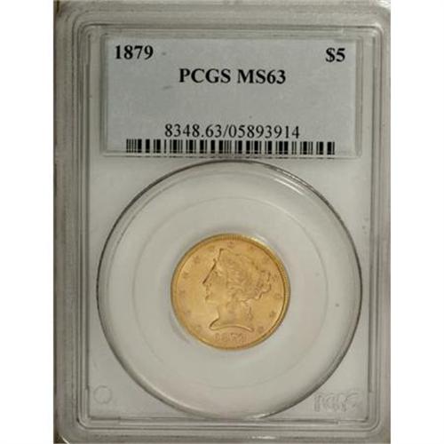 <B>1879 $5 MS63 PCGS.</B></I> Slightly satiny sun-gold surfaces present a pleasing appearance on this well-defined Select half eagle. Though the fields show light abrasions, these minor flaws are consistent with the grade assigned. Population: 28 in 63, 7 finer (12/07).<BR><BR><B>Coin Engraver:</B> Christian Gobrecht<BR><BR><b>Shipping:</b> Coins & Currency (<a target="_blank" href="http://www.heritageauctions.com/common/shipping.php">view shipping information</a>)