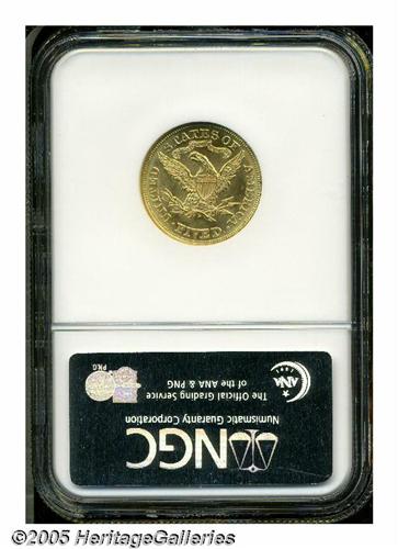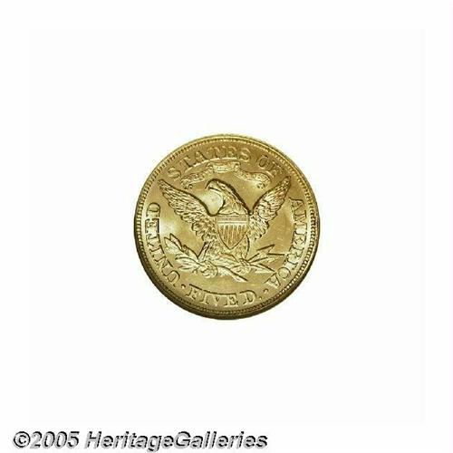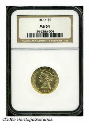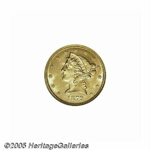 <B>1879<$5> MS64 NGC.</B></I> While certainly a common coin in the lower grades, high grade examples of this date are very elusive. Only 17 pieces have been graded at the near-Gem level by both NGC and PCGS, with a mere five coins finer (5/05)--this out of an original mintage of 301,920 business strikes. Moreover, our auction records indicate that only eight near-Gems have appeared for sale by the major houses over the past fifteen years, with a miniscule four graded finer. The present example features bright, flashy luster and brassy-gold patina, with all of the design elements revealing sharp definition. A few trivial marks preclude a higher grade. This is a very pleasing half eagle that is worthy of a high bid. Population: 14 in 64, 2 finer (5/05).