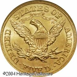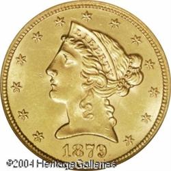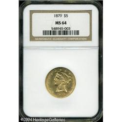 1879 $5 MS64 NGC. While certainly a common coin in <B>1879 $5 MS64 NGC.</B></I> While certainly a common coin in the lower grades, high grade examples of this date are very elusive. Only 12 pieces have been so graded by both of the major services with a mere five coins finer (11/04)--this out of an original mintage of 301,920 business strikes. Sharply defined throughout, the surfaces show soft, frosted mint luster and there are no reportable abrasions on either side. <BR><BR><B>Important notice:</B> Heritage usually auctions material at the rate of 200-250 lots per hour. On some occasions eBay Live bid software or the Internet may not be able to keep up with the pace of the auction. We recommend placing a realistic absentee bid now as insurance to avoid disappointment. Occasionally the auctioneer may eliminate or reject an eBay Live bid, and the auctioneer may also reopen a lot after the close of the eBay live bidding (usually because we missed an audience bid), and may reject your bid even if it shows you as the winning bidder. By bidding via eBay Live, you agree that Heritage may award the lot to another bidder at its sole discretion under the circumstances described above or any other reasonable circumstances. Since eBay bids are not shown to us until we open the lot on the floor, we treat those bids just like floor bids. In most cases the floor responds before the eBay bid is presented to us, due to Internet lag time, so for consistency we have made it a policy that floor bids are always considered first over tie eBay live bids. Also please note that all Heritage lots purchased through eBay Live carry a 20% Buyer's Premium. Please make sure you read the Terms and Conditions before you bid. This lot is being auctioned in conjunction with a live floor auction by Heritage Galleries & Auctioneers. All final auction and invoice information will be supplied by Heritage Galleries & Auctioneers, and all other information should be considered preliminary. Lot:6660