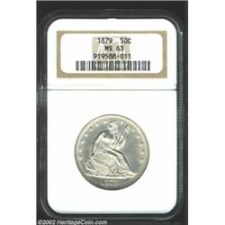 1879 50C MS63 NGC. A bright and razor-sharp specimen that has extensive luster and no individually significant abrasions. Only 4,800 pieces were struck, although many of these were apparently reserved by contemporary numismatists, akin to the low mintage Gold Dollars of the era.From the Ohio Collection. Important notice: We expect to be auctioning lots at the rate of 200-250 per hour. Sometimes eBay Premier live bid software cannot keep up with that pace, so we strongly recommend that you place a realistic proxy bid now as insurance to avoid disappointment. Also please note that all Heritage/CAA lots purchased through eBay Premier carry a 20% Buyer's Premium. Please make sure you read the Terms and Conditions.