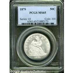 <B>1879 50C MS65 PCGS.</B></I> The 1879 Half Dollar is the first in a series of low-mintage issues that extends to the end of the Liberty Seated Half Dollar type. With the exception of the final year, every issue during this period was from a mintage ranging between 4,400 and 12,000 circulation strikes, each year with a small additional quantity of proof coins. This Gem example has extremely sharp obverse and reverse details with fully brilliant, untoned satiny surfaces. Population: 36 in 65, 47 finer (1/05).