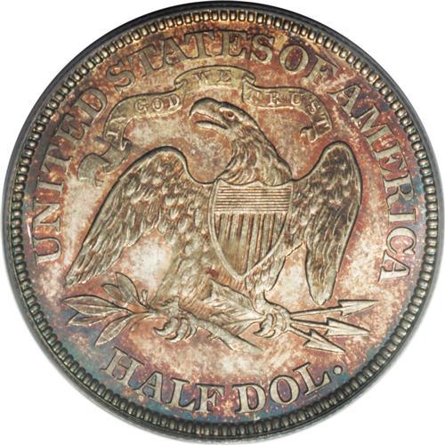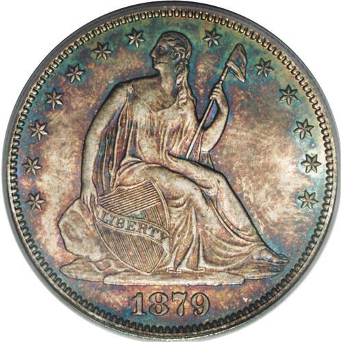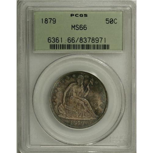 <B>1879 50C MS66 PCGS.</B></I> Type Two Reverse. A golden-brown Premium Gem with aqua-blue borders and sweeping satin luster. This sharply struck coin is unabraded aside from a solitary slender mark on the cheek. Only 4,800 pieces were struck, since the mints concentrated on silver dollar production in 1879. Population: 33 in 66, 14 finer (11/06).<BR><BR><b>Shipping:</b> Coin/Currency (<a target="_blank" href="http://www.heritageauctions.com/common/shipping.php">view shipping information</a>)