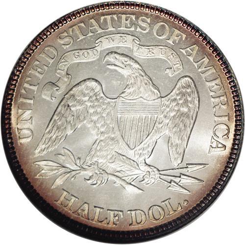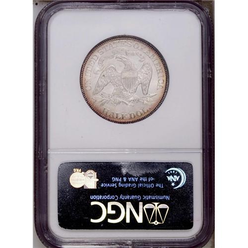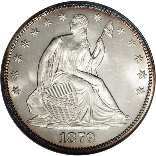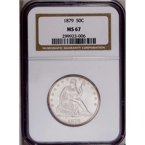 <B>1879<50C> MS67 NGC.</B></I> Type Two Reverse. Beginning in 1879 mintages for half dollars were severely limited, due to the implementation of the Bland-Allison Act of 1878 which required the mints to purchase vast amounts of silver bullion and produce large quantities of silver (Morgan) dollars. Only 4,800 business strikes were produced in this year. This is a stunning coin that displays frosty luster. With the exception of light toning around the rims, the surfaces are mostly brilliant with shimmering prooflike fields. Pinpoint striking details are seen throughout. Refreshingly preserved, especially on the reverse. A few minor contact marks and luster grazes on the obverse are mentioned for solely for accuracy, and do not detract from the coin's great eye appeal. Census: 8 in 67, 1 finer (2/06).