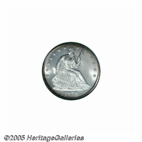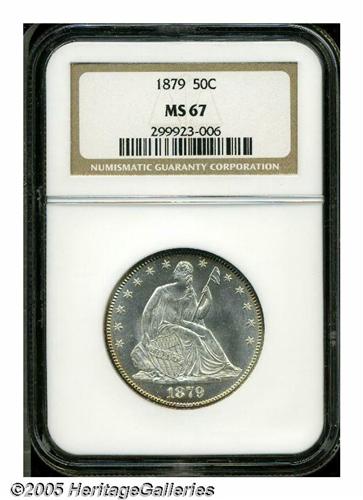<B>1879<50C> MS67 NGC.</B></I> Beginning in 1879 mintages for half dollars were severely limited. Only 4,800 business strikes were produced in this year. This is a stunning coin that was undoubtedly a "first strike" business strike. The surfaces are mostly brilliant with shimmering prooflike fields. Pinpoint striking details are seen throughout and there are no obvious or distracting abrasions on either side. Population: 7 in 67, 1 finer (5/05).