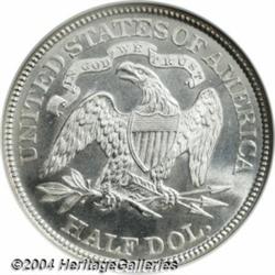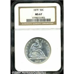 <B>1879<50C> MS67 NGC.</B></I> The 1879 half dollar is the first in a series of low-mintage issues that extends to the end of the Liberty Seated half dollar type. With the exception of the final year, every issue during this period was from a mintage ranging between 4,400 and 12,000 circulation strikes, each year with a small additional quantity of Proof coins. This Superb example has extremely sharp obverse and reverse details with fully brilliant and untoned satiny surfaces. Population: 6 in 67, 1 finer (6/04). <BR><BR><B>Important notice:</B> Heritage usually auctions material at the rate of 200-250 lots per hour. On some occasions eBay Live bid software or the Internet may not be able to keep up with the pace of the auction. We recommend placing a realistic absentee bid now as insurance to avoid disappointment. Occasionally the auctioneer may eliminate or reject an eBay Live bid, and the auctioneer may also reopen a lot after the close of the eBay live bidding (usually because we missed an audience bid), and may reject your bid even if it shows you as the winning bidder. By bidding via eBay Live, you agree that Heritage may award the lot to another bidder at its sole discretion under the circumstances described above or any other reasonable circumstances. Since eBay bids are not shown to us until we open the lot on the floor, we treat those bids just like floor bids. In most cases the floor responds before the eBay bid is presented to us, due to Internet lag time, so for consistency we have made it a policy that floor bids are always considered first over tie eBay live bids. Also please note that all Heritage lots purchased through eBay Live carry a 20% Buyer's Premium. Please make sure you read the Terms and Conditions before you bid. </span></font></tr></table></td></tr></table>