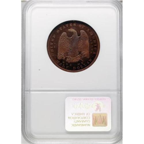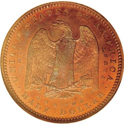 <B>1879 50C Morgan Half Dollar, Judd-1600, Pollock-1795, Low R.7, PR66 Red NGC.</B></I> The obverse is reminiscent of the standard Morgan dollar, but the border arrangement of stars and E PLURIBUS UNUM differs. The reverse features a large perched eagle with unfurled wings. The eagle clutches three large arrows and an olive branch. IN GOD WE TRUST is widely spread around the eagle. Struck in copper with a reeded edge.<BR>This beautiful pattern is orange-red with occasional dashes of sky-blue and olive-gold. Both sides are remarkably smooth, and the strike is crisp overall despite slight softness in the centers. NGC and PCGS combined have certified only seven examples, and the present piece is tied with one other for the honor of finest certified (5/07).<BR><I>Ex: Bowers and Merena, 8/98, lot 2096.</B></I><BR><I>From The Vanek Collection.</B></I><BR><BR><b>Shipping:</b> Coins & Currency (<a target="_blank" href="http://www.heritageauctions.com/common/shipping.php">view shipping information</a>)