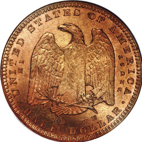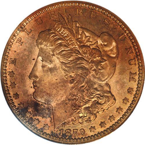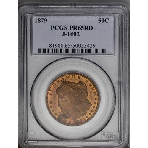 <B>1879<50C> Morgan Half Dollar, Judd-1602, Pollock-1797, R.7, PR65 Red PCGS.</B></I> The obverse is a smaller scale version of the regular issue 1879 Morgan dollar obverse. For the reverse, an eagle with lowered wings clutches an olive branch and a cluster of arrows. IN GOD WE TRUST is widely distributed across the reverse border, along with other statutory legends. Struck in copper with a reeded edge. The strike is good, if slightly soft in the centers. A few freckles of russet toning near the chin, otherwise the brick-red color is consistent throughout aside from a hint of olive color on the reverse. Magnificently preserved. A desirable Judd variety, since Morgan Dollar patterns are an important specialty, and other advanced collectors acquire 1879 pattern types (Stella, Schoolgirl, Washlady).