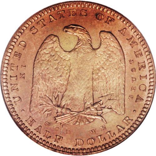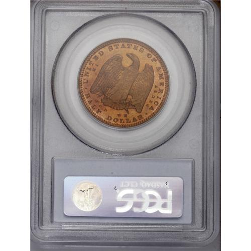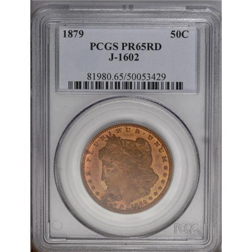 <B>1879 50C Morgan Half Dollar, Judd-1602, Pollock-1797, R.7, PR65 Red PCGS.</B></I> The obverse is a smaller scale version of the regular issue 1879 Morgan dollar obverse. For the reverse, an eagle with lowered wings clutches an olive branch and a cluster of arrows. IN GOD WE TRUST is widely distributed across the reverse border, along with other statutory legends. Struck in copper with a reeded edge. The strike is good, if slightly soft in the centers. A few freckles of russet toning near the chin, otherwise the brick-red color is consistent throughout aside from a hint of olive color on the reverse. Magnificently preserved. A desirable Judd variety, since Morgan Dollar patterns are an important specialty, and other advanced collectors acquire 1879 pattern types (Stella, Schoolgirl, Washlady).