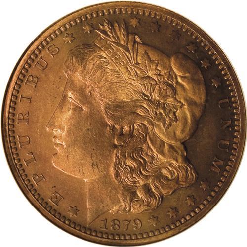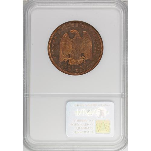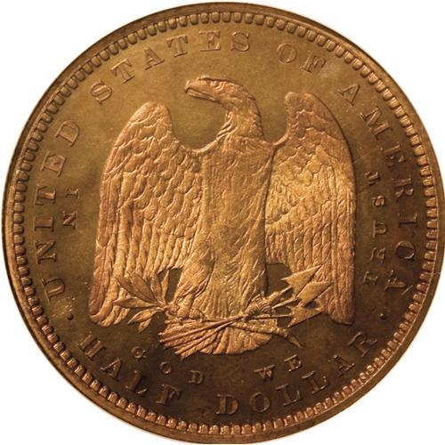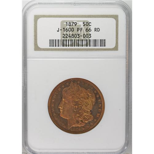 <B>1879 50C Morgan's Liberty Head Half Dollar, Judd-1600, Pollock-1795, Low R.7, PR66 Red NGC.</B></I> The designs are the same as described for Judd-1599. Struck in copper with a reeded edge. This is a sensational piece with fiery orange mint luster throughout. Central weakness is evident on both sides, although this piece is sharper than the J-1599 above. A few tiny discoloration spots on the obverse will serve the pedigree researcher. Indeed, these small characteristics clearly prove that this is the same piece offered by Bowers and Merena in their Tree Many Feathers Collection of September 2001 (actually sold in November). This Gem specimen is possibly the finest known example of the variety.<BR><I>Ex: Tree Many Feathers Collection (Bowers and Merena, 9/2001), lot 141.</B></I><BR><I>From The Jones Beach Collection.</B></I><BR><BR><b>Shipping:</b> Coin/Currency (<a target="_blank" href="http://www.heritageauctions.com/common/shipping.php">view shipping information</a>)