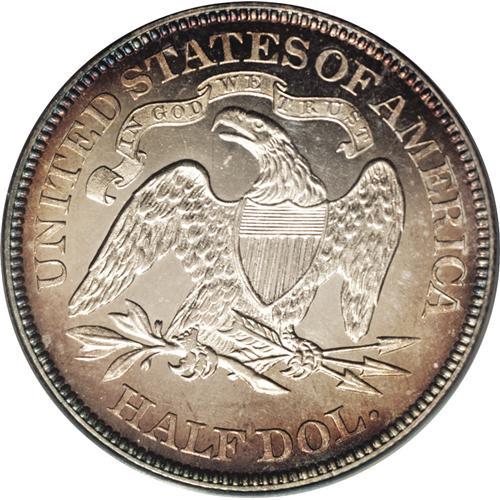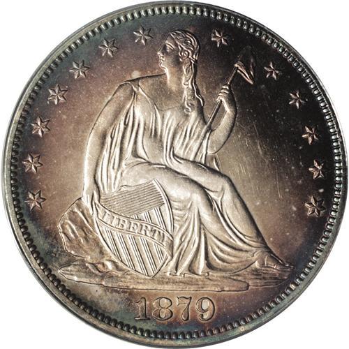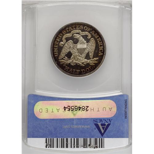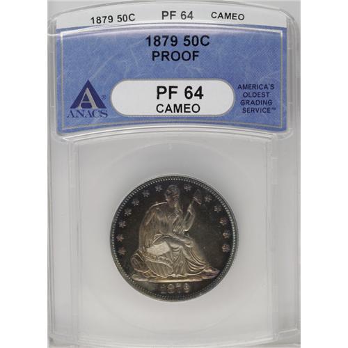 <B>1879<50C> PR64 Cameo ANACS.</B></I> Type One Reverse. This sharply struck Cameo proof has pale golden toning at the centers, gradually deepening to russet, lilac, and blue color. A lovely example that approaches Gem quality.