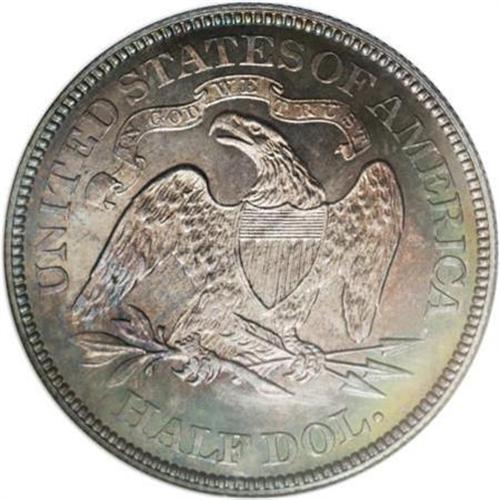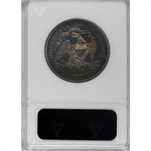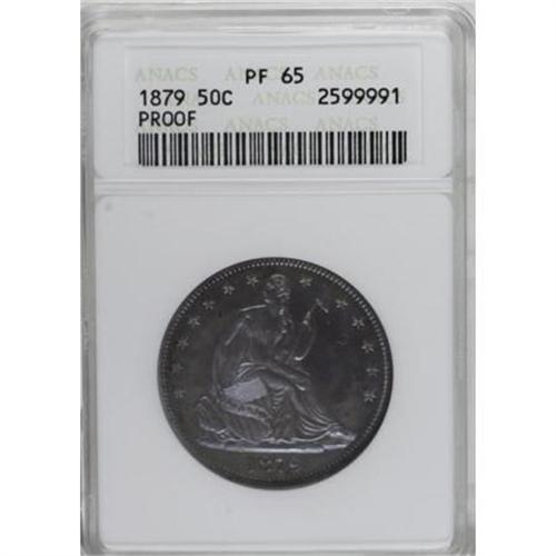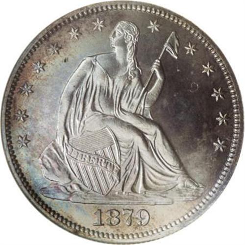 <B>1879 50C PR65 ANACS.</B></I> Type Two Reverse. Beautiful powder-blue, peach, aquamarine, and violet-rose endow this nicely mirrored and unabraded Gem. A good strike despite minor incompleteness on Liberty's hair and the eagle's left (facing) ankle. A low mintage date, since the Philadelphia Mint focused on silver dollar coinage.<BR><BR><B>Coin Engraver:</B> Christian Gobrecht<BR><BR><b>Shipping:</b> Coins & Currency (<a target="_blank" href="http://www.heritageauctions.com/common/shipping.php">view shipping information</a>)