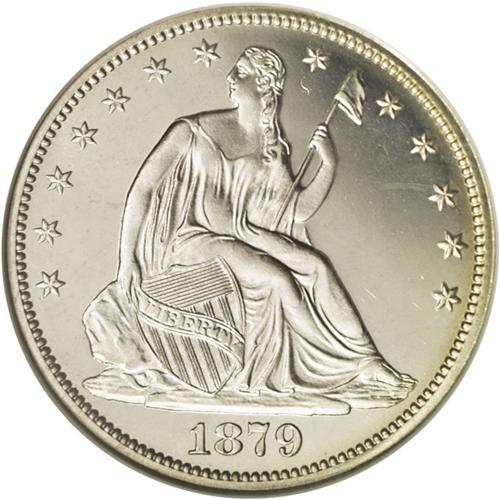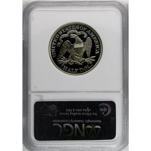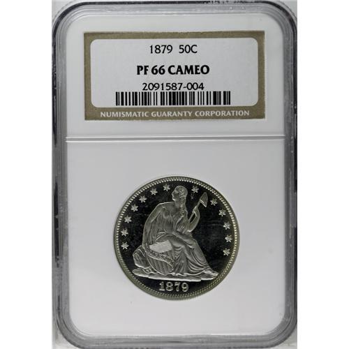 <B>1879<50C> PR66 Cameo NGC.</B></I> Type One Reverse. Despite the low mintages of 5,900 business strikes and 1,100 proofs, either can be readily found as they were saved by collectors at the time of issue because of anticipated low mintages. That said, 1879 proofs with the cameo designation are not all that easily obtainable as evidenced by the population reports; NGC and PCGS combined have certified about 50 such coins, mostly at the Gem and lower grades. The current PR66 example displays somewhat of a white-on-black appearance as the boldly defined devices seem to float over the glassy fields. A barely perceptible film of light gold color hugs the rims of this otherwise untoned specimen, and an occasional faint slidemark on Liberty's highpoints can be seen under high magnification. This coin will not disappoint the new owner. Census: 5 in 66 Cameo, 5 finer (6/06).<BR><I>From The Mulholland Collection.</B></I>