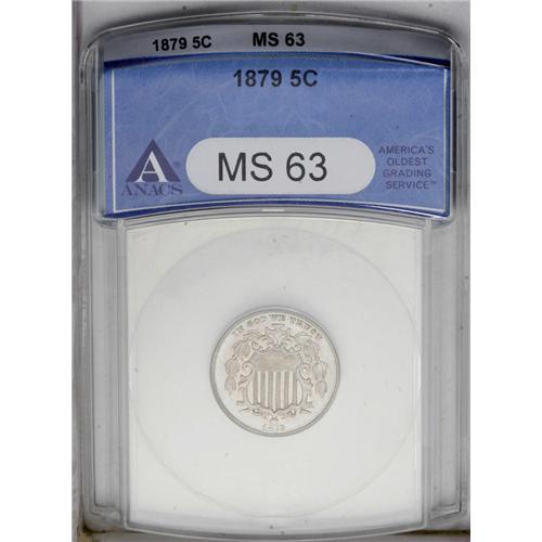 <B>1879<5C> MS63 ANACS.</B></I> A sharply struck and fully lustrous Mint State example of the Normal Date variety for this year. Most 1879 Shield nickels seen today are proof examples, and many of those are overdates. Any offering of a Mint State example of this date is cause for celebration among collectors of this series.