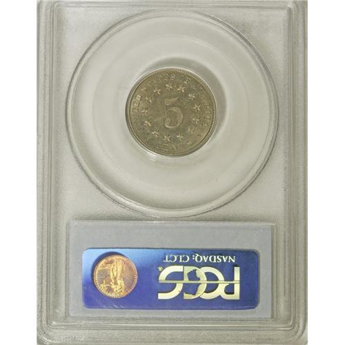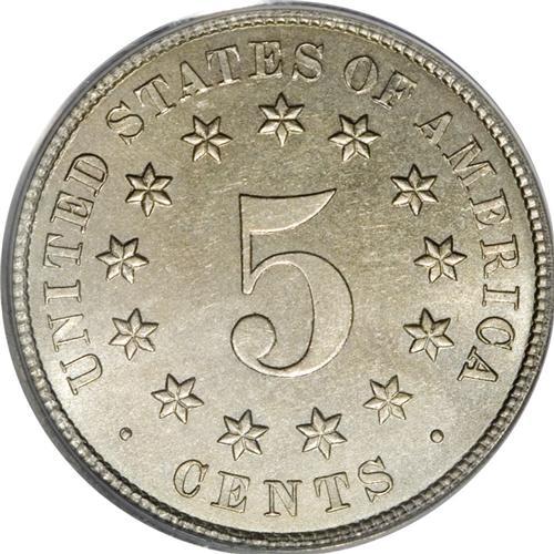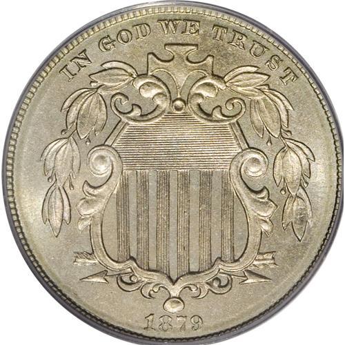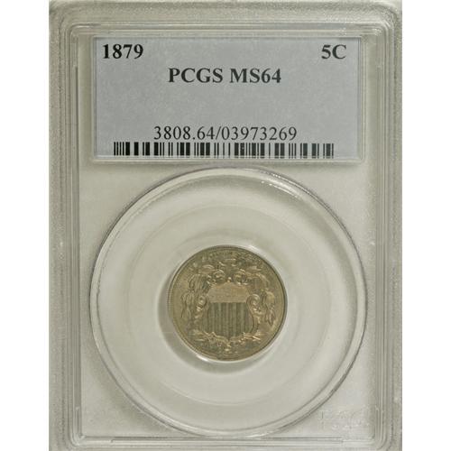 <B>1879 5C MS64 PCGS.</B></I> This satiny and pinpoint-sharp near-Gem is from an uncommonly low mintage of 25,900 pieces. Essentially unabraded, and attractively toned in tan-gold and slate-gray. Population: 16 in 64, 39 finer (2/07).<BR><BR><b>Shipping:</b> Coins & Currency (<a target="_blank" href="http://www.heritageauctions.com/common/shipping.php">view shipping information</a>)