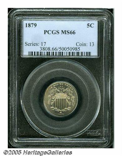 <B>1879<5C> MS66 PCGS.</B></I> This example is very well struck, with beautiful luster and full mint bloom. The surfaces display two or three tiny nicks overall, and there are numerous faint die polish lines (as struck) on each side. The eye appeal of this coin is simply superb, and it is certainly one of the most attractive Shield nickels that we have seen recently. Although this is not the scarcest date in the series, it is decidedly scarce in this premium state of preservation, as the population report will attest. Population: 14 in 66, 0 finer (3/05).